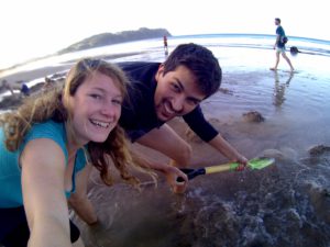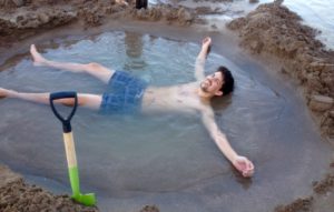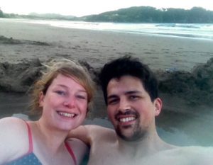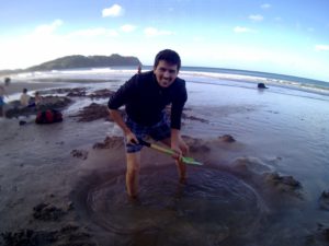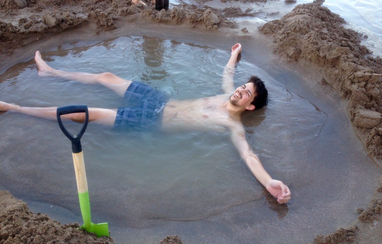 Wenn man schon auf der Coromandel Halbinsel ist sollte man sich die Touristenattraktion am hot water beach nicht entgehen lassen. Bewaffnet mit Schaufeln (und der ein oder anderen Flasche Wein) treffen sich am frühen Abend Touristen aller Welt an besagtem Strand und buddeln was das Zeug hält um sich in dem eigenen Pool mit heißem Thermalwasser aufzuwärmen.
