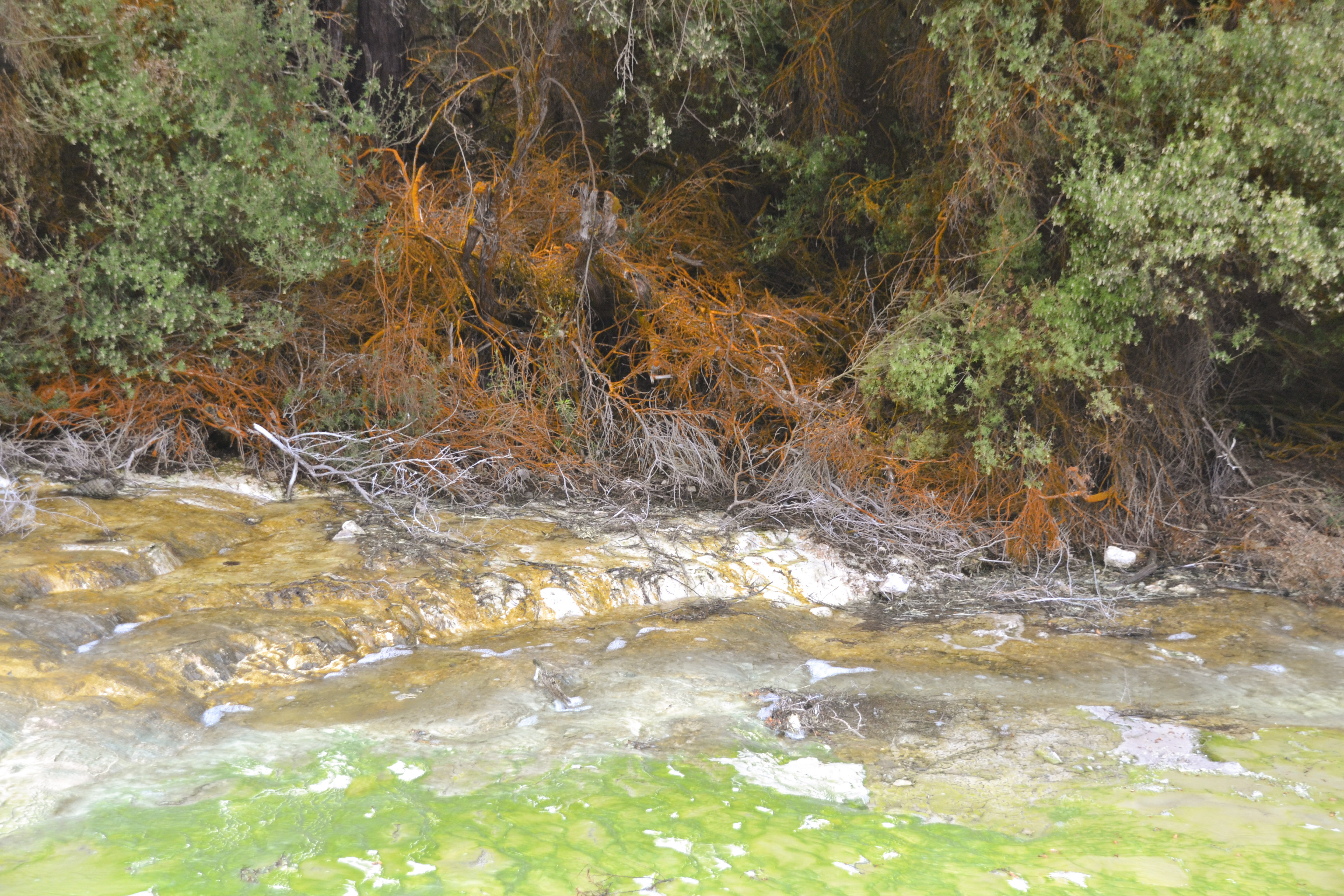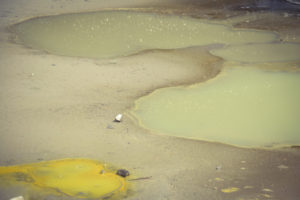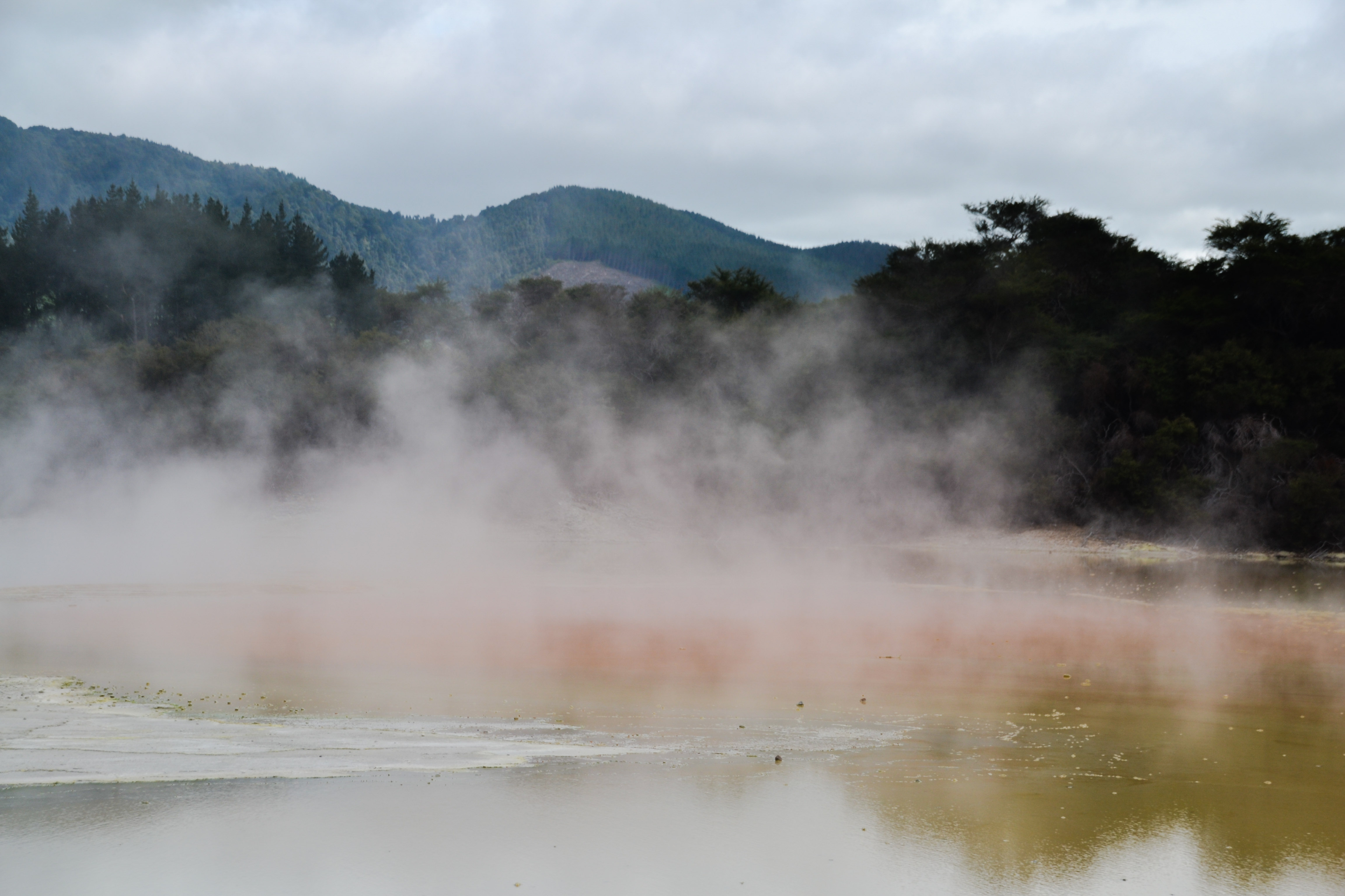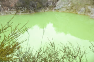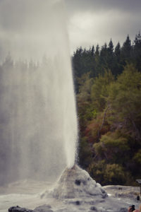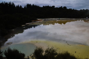 Neuseeland liegt an der Grenze der australischen und der pazifischen Platte, daher gibt es hier neben vielen Vulkanen auch Geothermalgebiete wie das in Wei-o-tapu nahe Rotorua, in dem wir neben einem Geysir, der heißes Wasser knapp 10m in die Höhe sprüht, auch die verschieden farbigen heißen Quellen und blubbernden Schlammlöcher bestaunen konnten. Nicht unerwähnt bleiben sollte auch der beständige „Geruch“ nach faulen Eiern (Schwefel), der über der kompletten Stadt Rotoua liegt. Den Bewohnern muss wohl der Geruchssinn abhanden gekommen sein…