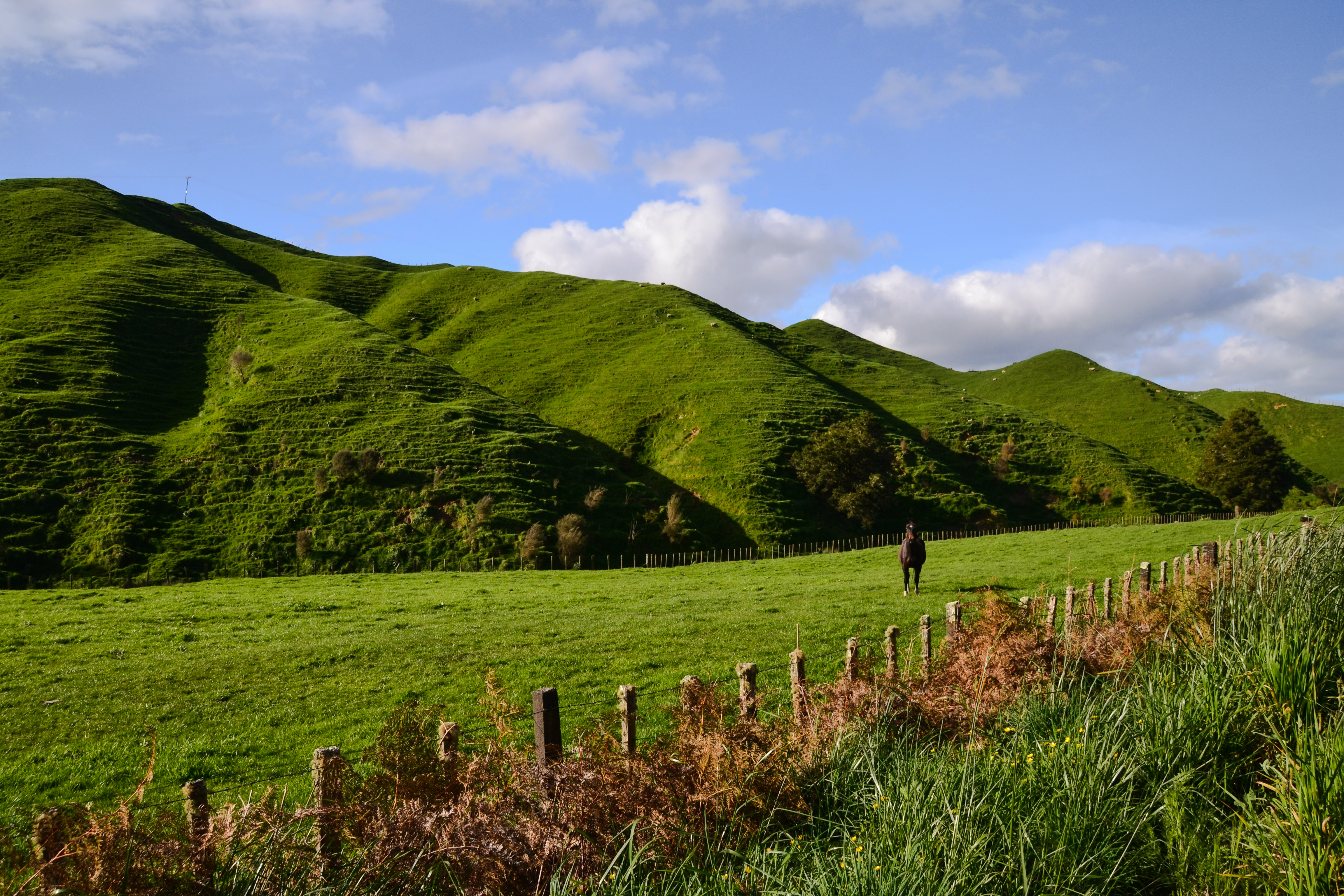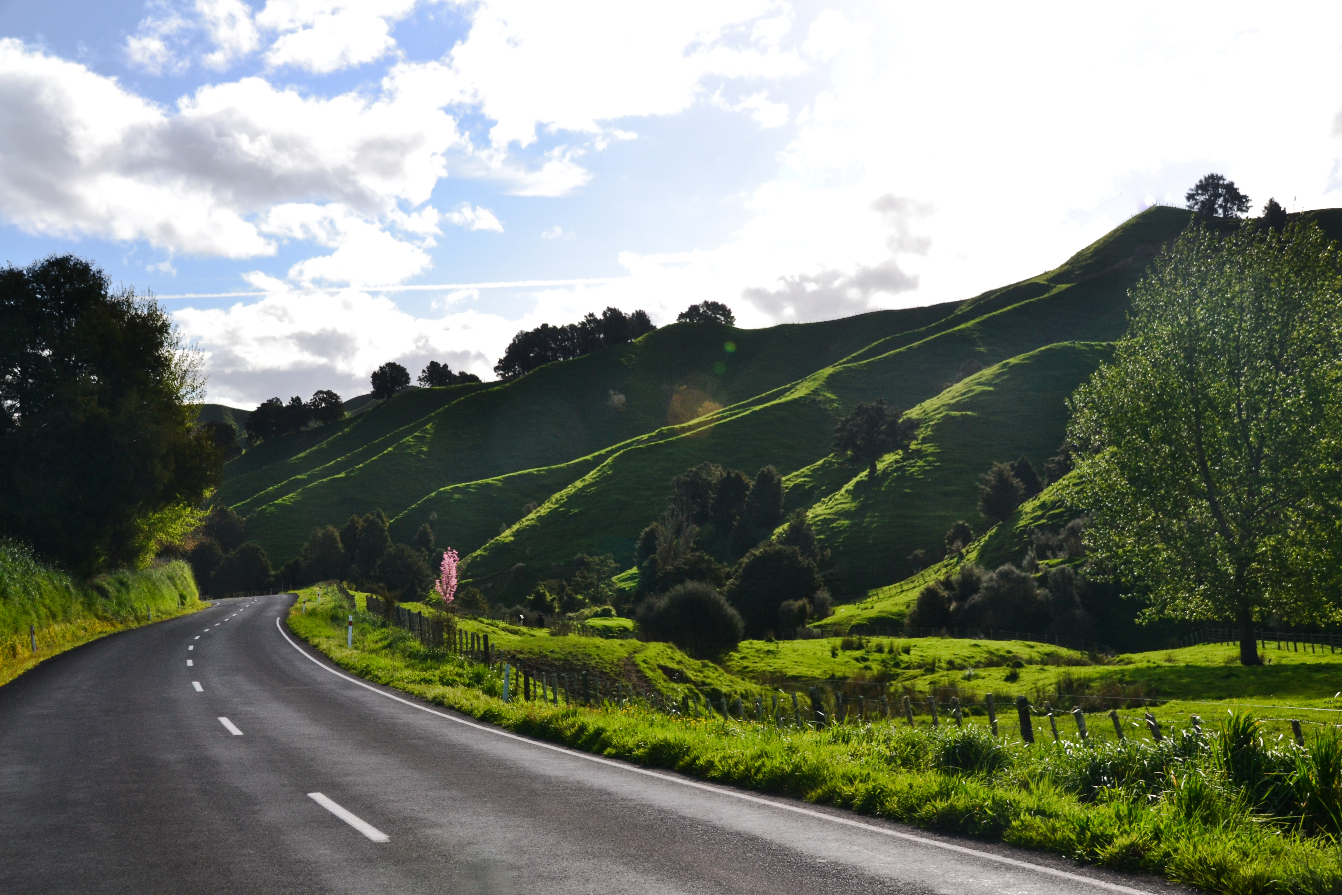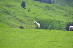 Der Weg zum Campingplatz führte über den „forgotten world Highway“. Der Name sagt wohl schon genug.. wir bekamen so gut wie nie andere Fahrzeuge zu Gesicht – kein anderer neuseeländischer Highway wird weniger befahren als dieser. Seltsam, denn es ist mit Sicherheit einer der schönsten Highways der Welt. Man fährt vorbei an grünen Hügeln, blühenden Bäumen, einem plätscherndem Fluss und vielen, vielen Schafen, Neuseeländisches Naturgesetz: auf jedem Hügel trohnt ein stolz dreinblickendes Schaf. Und wenn man mitten auf dem Highway stoppt um zu fotografieren, kommt ein neugieriges Pferd angetrabt um die Lage zu checken. Ganz im Gegensatz zu den Kühen: they just don’t give a f***.