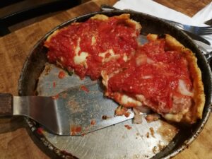 Mit Backpack in Chicago angekommen bezogen wir zunächst einmal unser Hotel inmitten dieser riesigen, lauten, strahlenden und ganz besonderen Stadt. Natürlich verbrachten wir den Abend in der City. Und zwar gönnten wir uns in einem wohl unglaublich beliebten Lokal Chicagos kulinarisches Highlight: eine deep dish Pizza. Der Preis ließ uns zunächst schlucken, doch natürlich wollten wir uns dieses besondere Gericht nicht entgehen lassen. Und dies war eine gute Idee: diese – tatsächlich winzige Pizza überzeugte uns durch die krossen Butterstreusel, die geschmackliche Füllung und hach: war scho geil.
