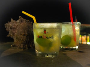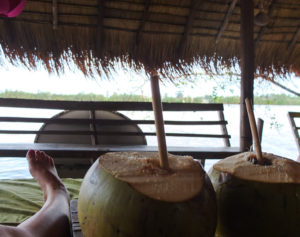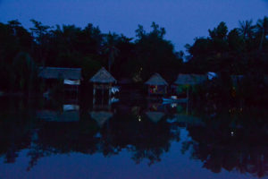 Und zwar nach Kampot. Zwei Stunden Minivanfahrt von Sihanoukville entfernt begrüßten uns jede Menge Schwalben, die aufgeregt über den Fluss flatterten. Man konnte sogleich erkennen, dass es eine entspannte Stadt ist und eine gute Mischung aus touristisch und Local Village. Unsere Unterkunft erinnerte uns auch diesmal an ein Plätzchen an dem man gerne seine Flitterwochen verbringen würde. Sehr romantisch steht die Basthütte in einem hübsch bepflanzten Garten und es sind nur 20 Meter bis zum Fluss. Und die Mitarbeiter waren entweder sehr freundlich oder dauerbekifft.. Gleich am Ankunftsabend gönnten wir uns einen superleckeren Caipirinha und hatten dazu einen tollen Blick auf den Fluss. Ganz schön schön war das..