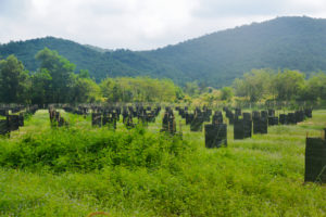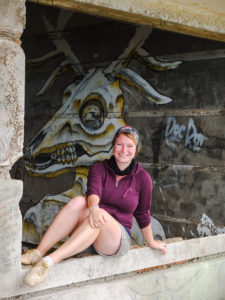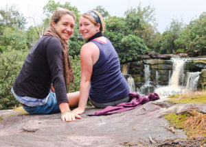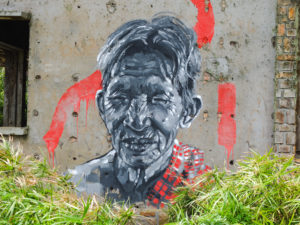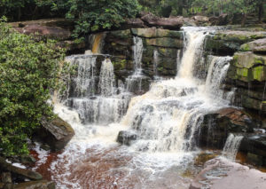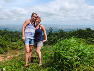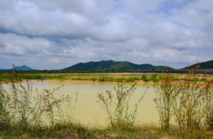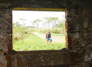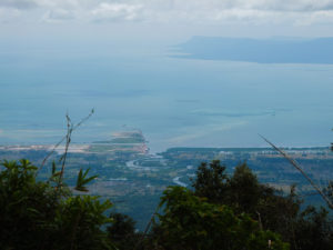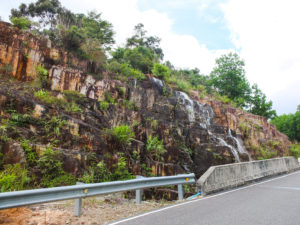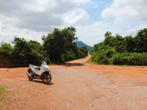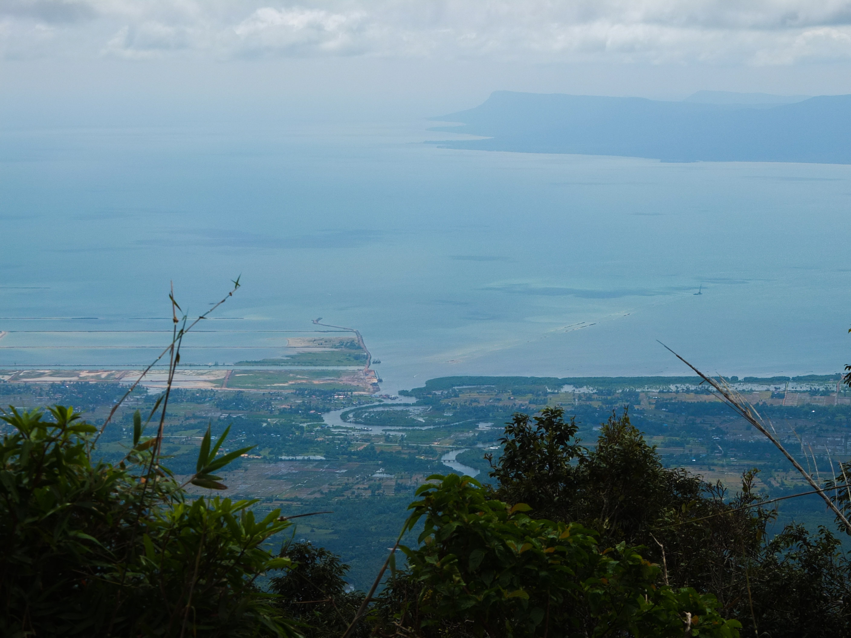 Der Roller brachte uns auch am nächsten Tag wohin wir nur wollten um die tolle Gegend um Kampot zu sehen. Diesmal wollten wir zum Bokor Nationalpark fahren um die vielversprechende Aussicht auf Dschungel und Küste zu sehen. Und auch schon die kurvige Strecke den Berg hinauf war echt cool. Immer mal wieder konnten wir Wasserfälle sehen oder Baumriesen, die sich schon halb auf die Straße lehnten. Oben angekommen war die Sonne verschwunden und ein kühler Wind pfiff uns um die Ohren. Wir schauten uns einen ganz coolen Wasserfall an und spazierten ein bisschen durch den Dschungel. Auf dem Rückweg wollten wir einen Blick auf die Salzfelder direkt am Meer werfen und parkten unseren Roller etwas neben der Straße und liefen zu einem verfallenen, alten Backsteinhaus. Dies war voller Sprayereien und von der Terasse aus konnten wir eine schöne Aussicht genießen. Und je weiter wir nach unten kamen desto wärmer wurde es wieder und desto klarer wurde die Sicht. Und die war dann wirkich einzigartig. Zurück am Hostel packten wir unsere Rucksäcke, denn es sollte weiter gehen nach Laos. Doch erst mal nach Phnom Penh und von dort aus weiter schauen. Und vor der anstrengenden Fahrt chillten wir noch herrliche 1,5h in einem Spa und tranken mit Seeblick leckere Kokosnüsse und probierten richtig gute Tapas. So konnte sie weitere Reise immerhin entspannt beginnen.