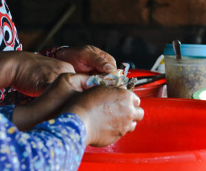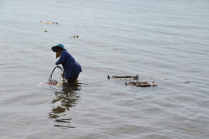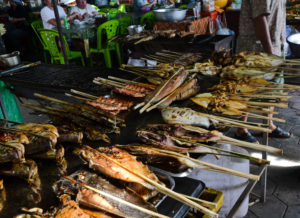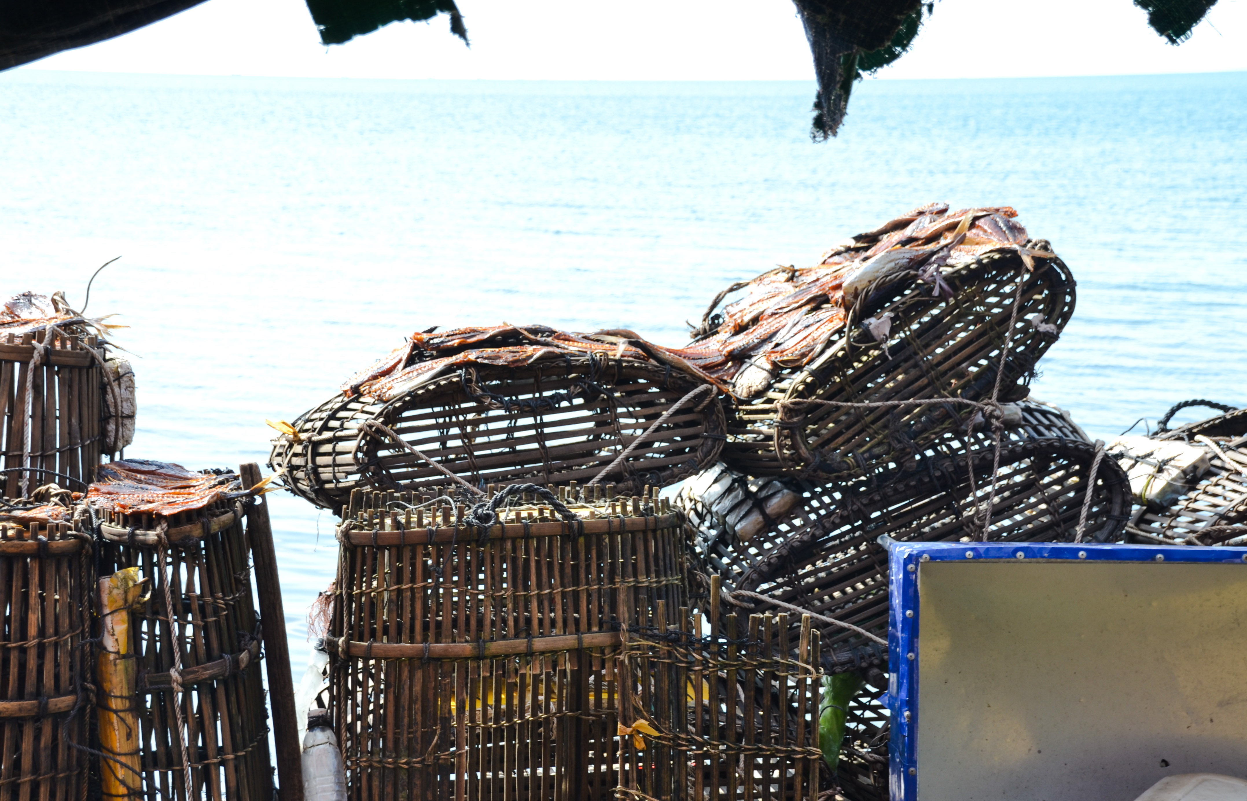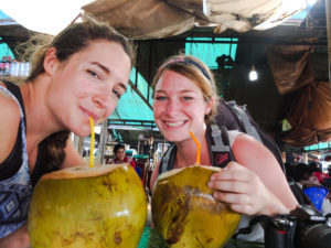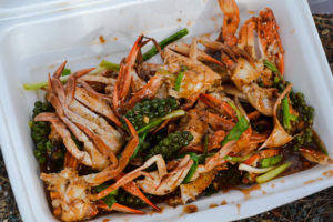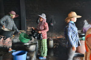 Dort bekamen wir auch genauere Instruktionen über den weiteren Weg. Dieser führte uns, vorbei an Plantagen, Reisfeldern und Palmen bis hin zum Strand von Kep. Und dort waren wir schon ganz gespannt auf den so oft empfohlenen Crab Market. Die Lautstärke und Aufdringlichkeit der Krabbenverkäuferinnen schreckte uns jedoch zunächst ab. Genau wie die Brutalität, mit der die armen Krabben hingerichtet wurden. Doch andere Touristen redeten auf uns ein und so waren wir nur wenige Sekunden später stolze Besitzer von 3 Krabben, die kurz zuvor frisch aus dem Meer gefischt worden waren. Und bevor wir unsere Krabben in Sicherheit bringen konnten wurden sie uns schon aus der Hand gerissen, zerhackt und ins kochende Wasser geworfen. Noch Frühlingszwiebeln und Pfefdersauce drüber und schon hielten wir die sterblichen Überreste unserer Krabben in einer Styroporschachtel verpackt, in den Händen. Naja sie sollten nicht umsonst gestorben sein. Deshalb suchten wir uns ein schönes Plätzchen am Meer und starteten die schmutzigste Krabben-puhl-Aktion, die Südostasien je gesehen hatte. Und wir waren begeistert. Besonders die rote Pfeffersauce war ein kulinarisches Erlebnis erster Klasse.